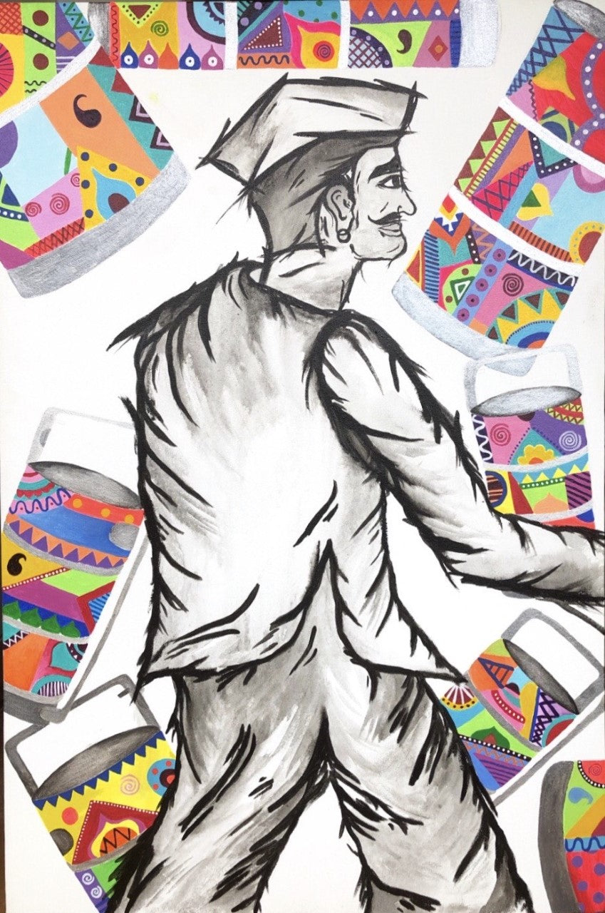 This painting is a combination of my ethnic culture and tradition and personal upbringing. The black and white visual represents the sights and sounds of Mumbai which one sees on a daily routine in this beautiful metropolitan city. This painting brings out the importance of a the Dabbawala ( a man who carries children's food from their home to school at lunchtime ). The portrait is contrasted with colourful geometric designs which are inspired by Ajrakh and Rogan Handicrafts from my motherland, Kutch. The Rabari tribe in Kutch is known for these magnificent textile designs. The use of black paint highlights the historical beliefs of the Rabari tribe as black is the most sacred colour for them.